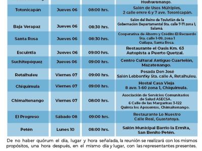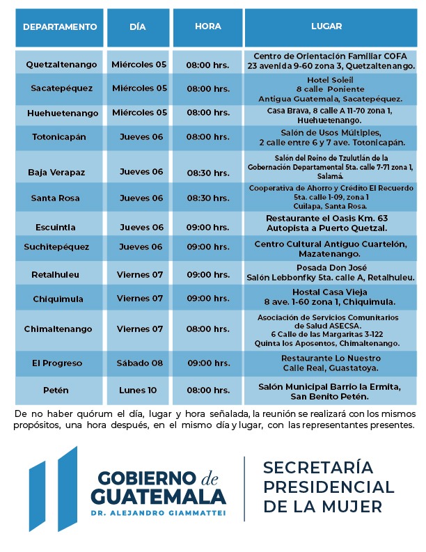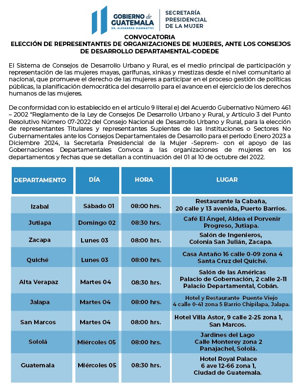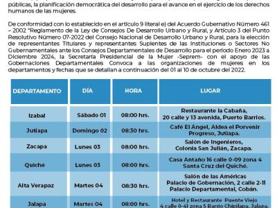 La SEPREM como entidad responsable de convocar a las organizaciones de mujeres, de los distintos departamentos de la República de Guatemala, para realizar la elección de Representante Titular y Suplente para ser parte del Consejo Departamental de Desarrollo CODEDE, insta a las organizaciones de mujeres para que participen en la Asamblea de “Elección de Representante Titular y Suplente ante el CODEDE" para el periodo de octubre 2022 a octubre 2024” que se llevarán a cabo en los 22 departamentos de la República del 1 al 10 de octubre de 2022.