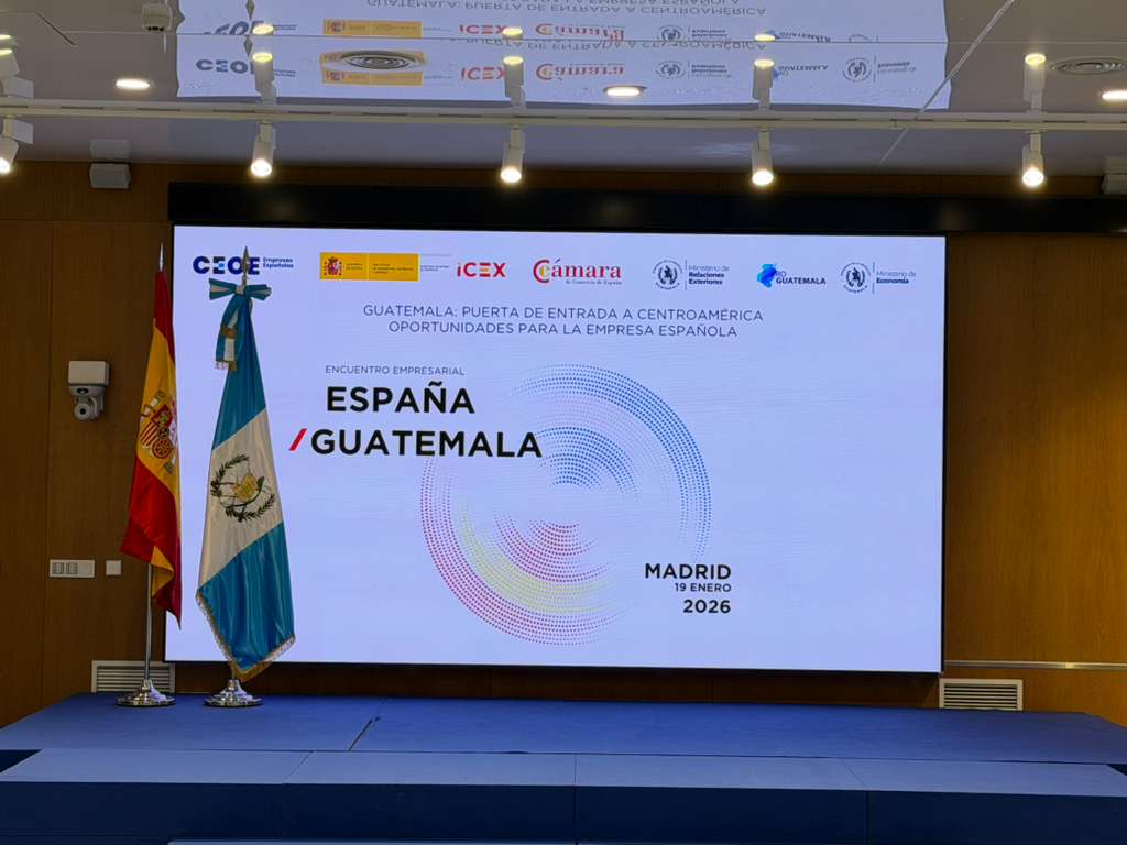 Madrid, España, 19 de enero de 2026. La Embajada de Guatemala en España, en apoyo al Ministerio de Economía (MINECO) y en coordinación con la Confederación Española de Organizaciones Empresariales (CEOE), acompañó la realización del encuentro empresarial “Guatemala: puerta de entrada a Centroamérica, oportunidades para la empresa española”, un espacio estratégico para fortalecer los lazos económicos y comerciales entre Guatemala y España.