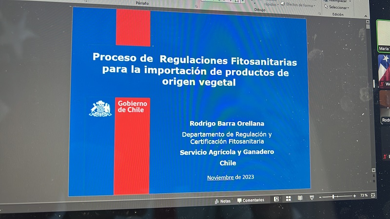 Asimismo, se describió el proceso para iniciar la apertura de admisibilidad agrícola a Chile, con una presentación acompañada de imágenes de los formularios que deben completar los exportadores.