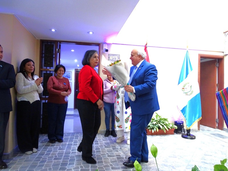 El momento también fue propicio para destacar a la señora Mildred Tohon, una de las guatemaltecas de más larga trayectoria residiendo en el Perú, a quién el Embajador Meneses Coronado entregó un reconocimiento por su vínculo con la comunidad, además del aprecio y gratitud. Asimismo, se expresó especial agradecimiento a la señora María Rita Haro López, colaboradora de la Embajada de Guatemala en Perú, por sus más de 42 años de servicio ininterrumpido y ejemplar dedicación.