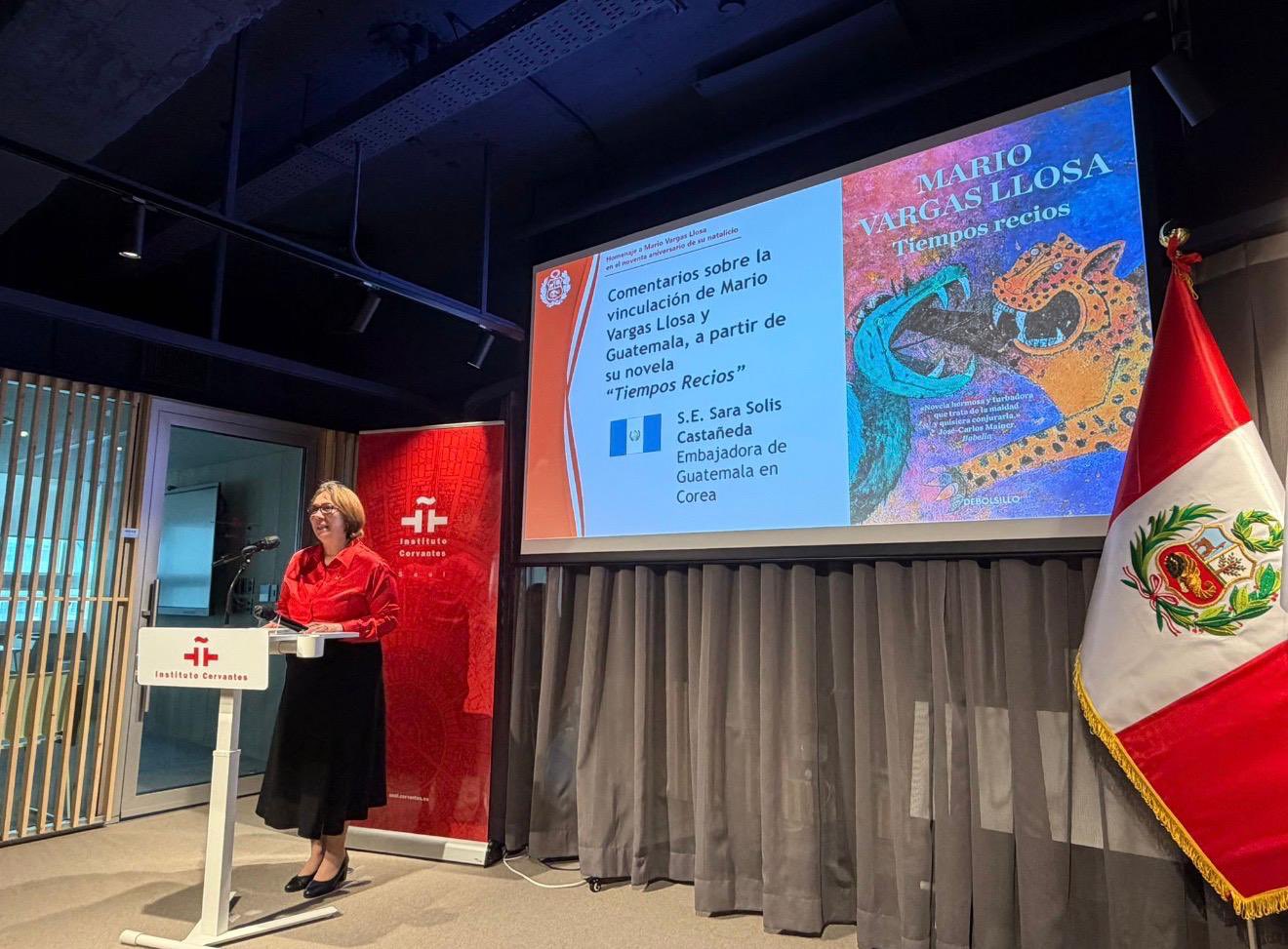 Seúl, Corea del Sur, 20 de abril de 2026. La embajadora de Guatemala en Corea del Sur, Sara Solís, asistió al homenaje dedicado al escritor Mario Vargas Llosa en el Instituto Cervantes de Seúl. Durante la actividad se destacó la novela Tiempos recios y el valor de la literatura como puente entre naciones.