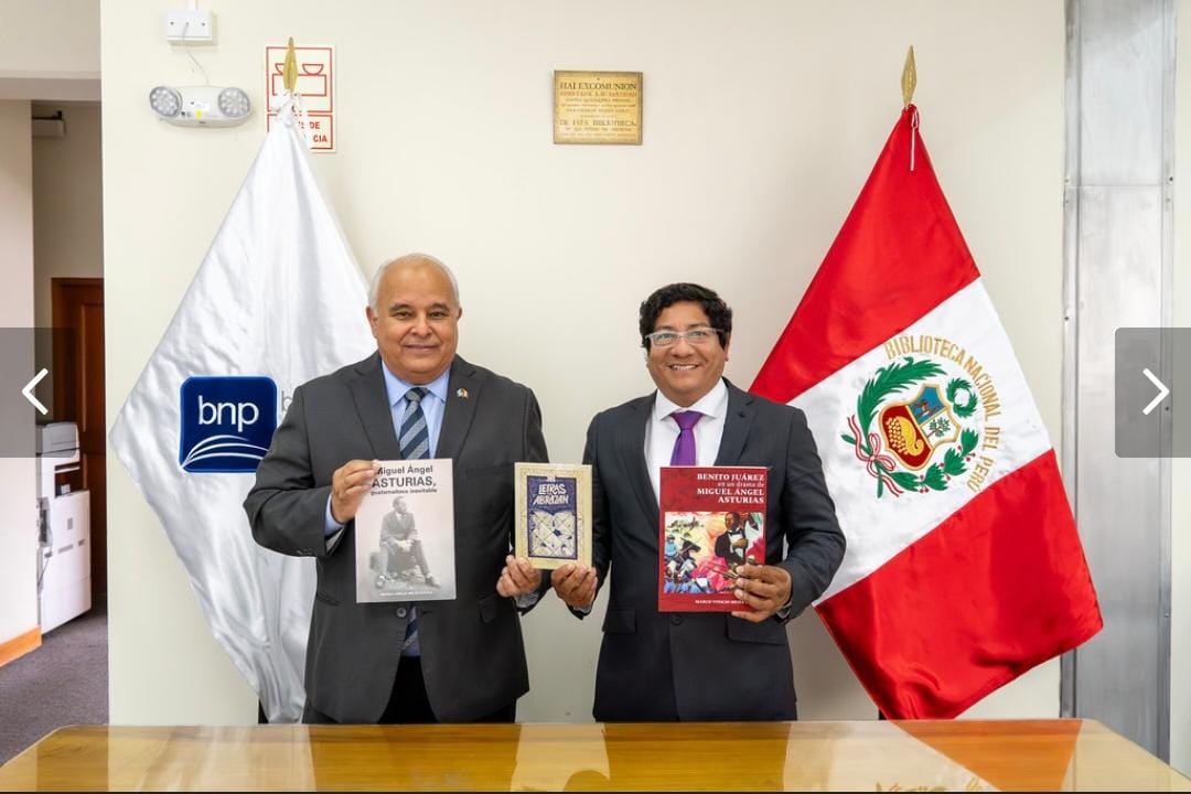 Lima, Perú, 7 de noviembre de 2025. El embajador de Guatemala en Perú, Herbert Estuardo Meneses Coronado, sostuvo un encuentro con el señor Juan Yangali Quintanilla, jefe institucional de la Biblioteca Nacional del Perú. El propósito fue hacer entrega de obras literarias recientemente editadas del Nobel de Literatura guatemalteco Miguel Ángel Asturias, a fin de promover su difusión y contribuir al fortalecimiento de los lazos culturales entre Guatemala y el Perú.