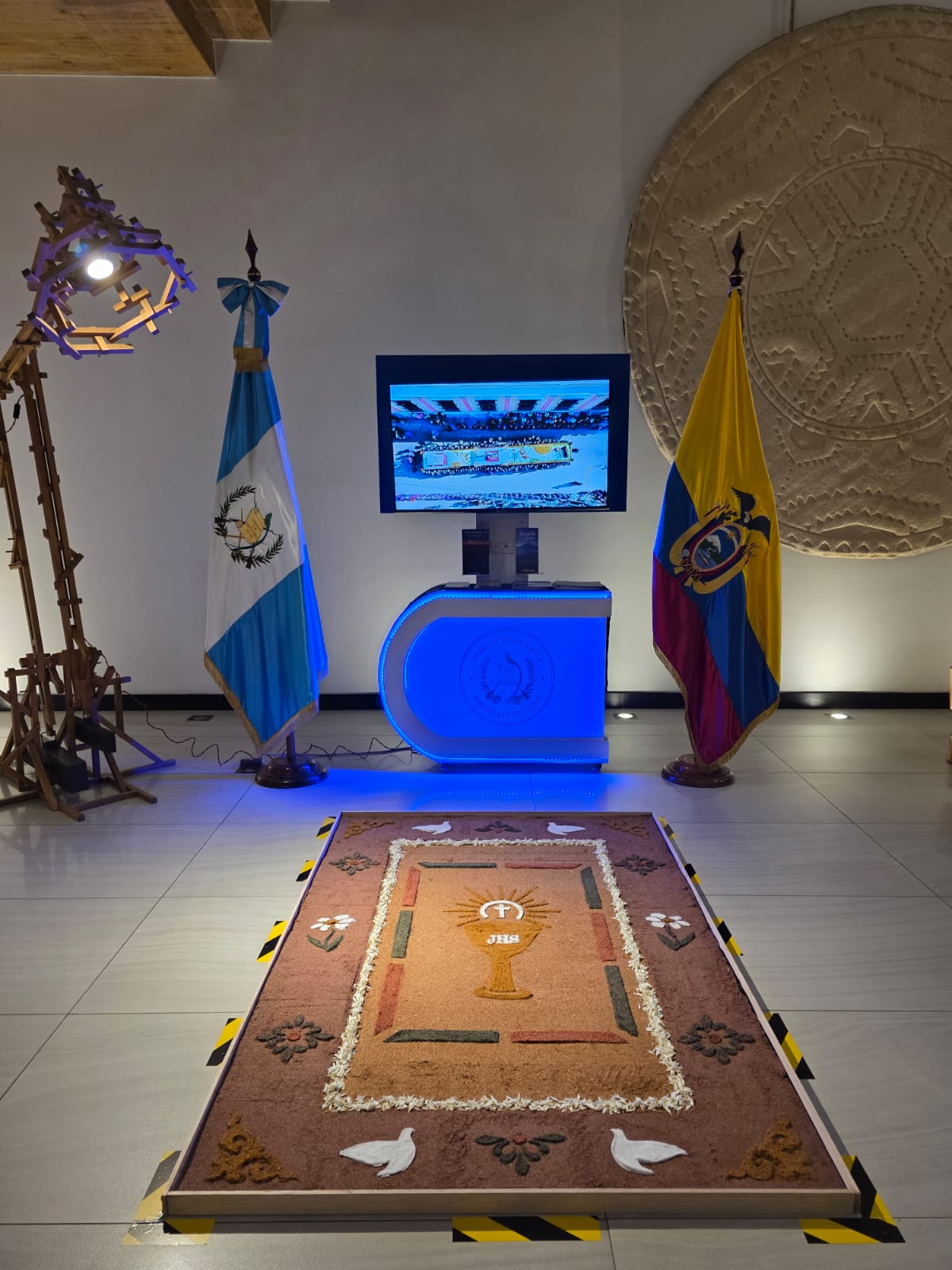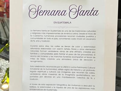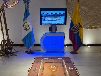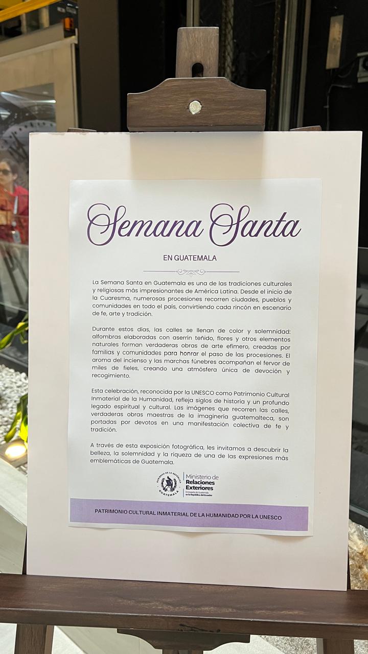 Quito, Ecuador, 27 de marzo de 2026. La Embajada de Guatemala en Ecuador inauguró en el Edificio Metropolitan de Quito la exposición "Semana Santa en Guatemala", una muestra que incluye una alfombra tradicional, fotografías y material audiovisual sobre las celebraciones de Semana Santa en el país.