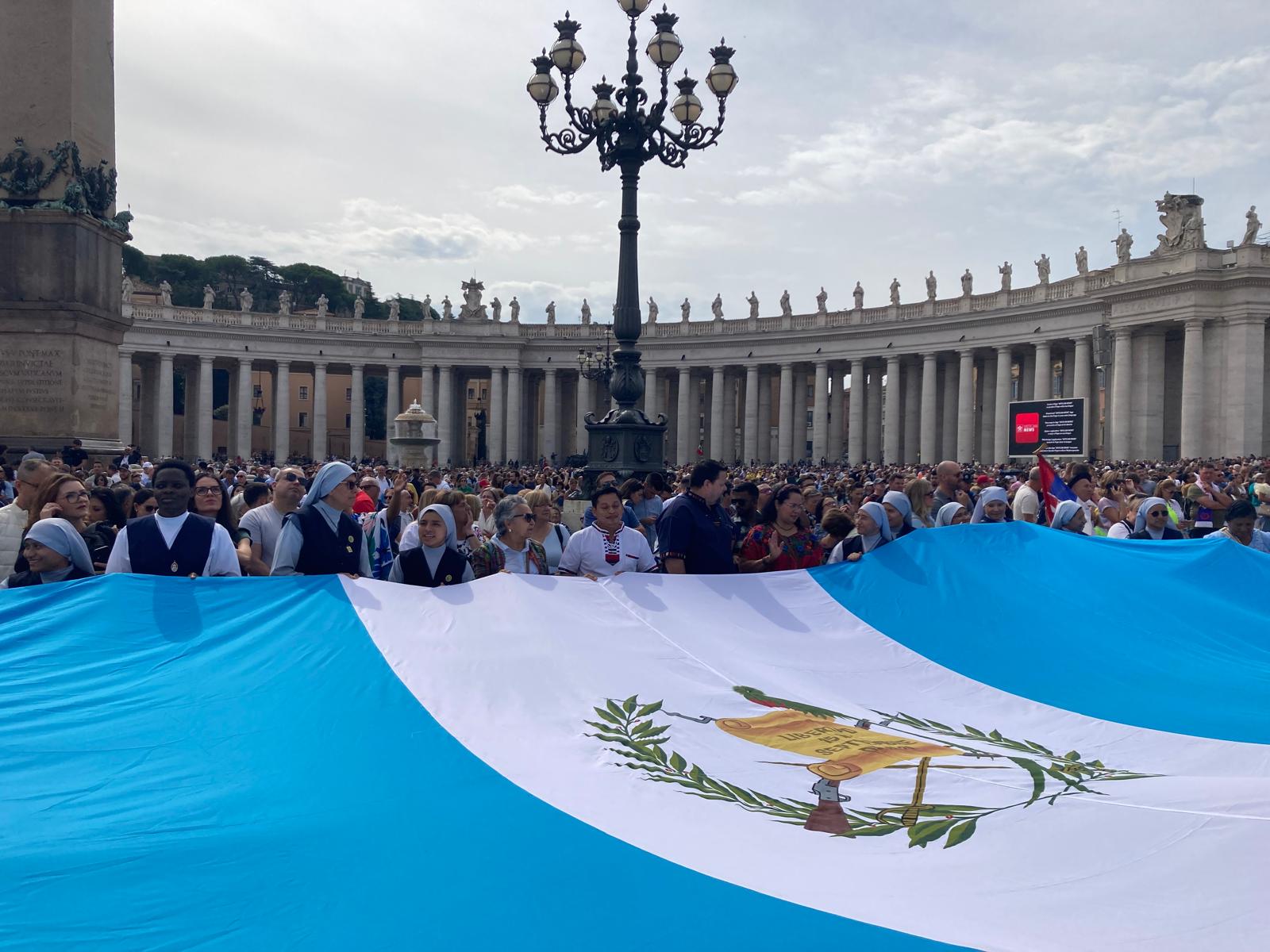 Una bandera gigante de Guatemala ondeó en la Plaza de San Pedro por manos de la Embajada de Guatemala y la comunidad de connacionales en Roma, para saludar al Santo Padre en el mes patrio.