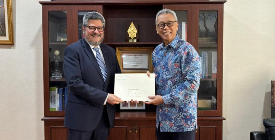 Yakarta, Indonesia, 2 de marzo de 2026. El Embajador de Guatemala Estuardo Roldán entregó las copias de estilo al Director General de Protocolo y Asuntos Consulares del Ministerio de Relaciones Exteriores de Indonesia, Andy Rachmianto, como parte del procedimiento diplomático correspondiente.