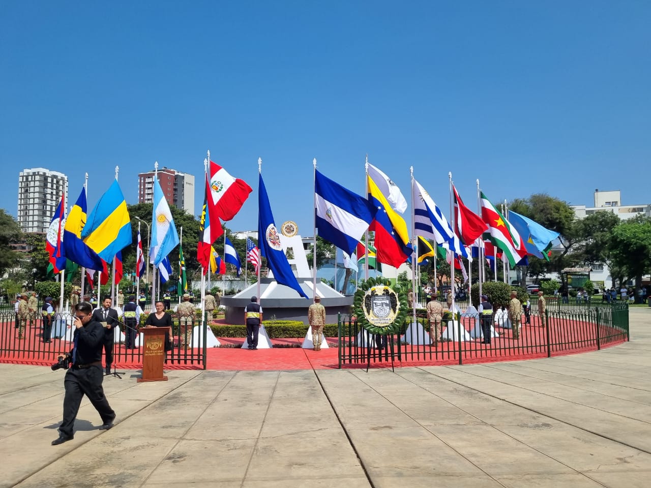 La ceremonia fue presidida por la alcaldesa del distrito, Mónica Tello, y contó con la participación de representantes del Cuerpo Diplomático que izaron sus respectivos pabellones nacionales, así como de autoridades nacionales y locales.