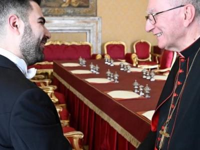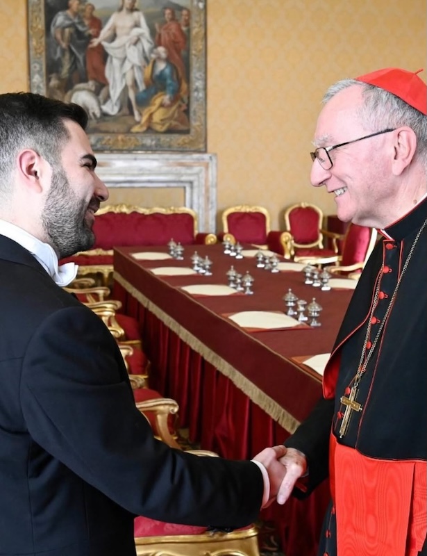 Posteriormente, el Embajador Palomo Vila sostuvo una reunión bilateral con Su Eminencia Reverendísima el Cardenal Pietro Parolin, Secretario de Estado de la Santa Sede. Durante el encuentro se abordaron diversos temas de interés común, entre ellos la conmemoración del 90.º aniversario del establecimiento de las relaciones diplomáticas entre Guatemala y la Santa Sede, en marzo de 2026.