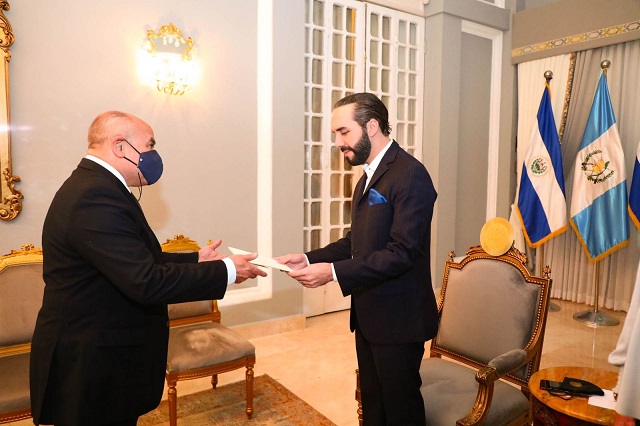 San Salvador, 13 de septiembre de 2021. El embajador Rubén Estuardo Nájera presentó al presidente de El Salvador, Nayib Bukele, sus Cartas Credenciales como embajador extraordinario y plenipotenciario de Guatemala, durante un acto celebrado el pasado 9 de septiembre en la Casa Presidencial de ese país.