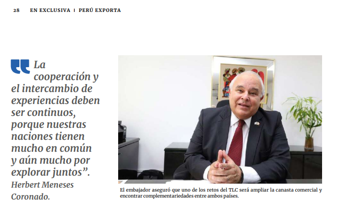 Lima, Perú, 22 de enero de 2026. En una reciente entrevista concedida a la Revista Perú Exporta, de la Asociación de Exportadores del Perú (ADEX), el Embajador de Guatemala en el Perú, Herbert Estuardo Meneses Coronado, resaltó la importancia estratégica del Tratado de Libre Comercio (TLC) entre Guatemala y el Perú como un instrumento que no crea la relación bilateral, sino que la ordena, le otorga previsibilidad y la potencia.