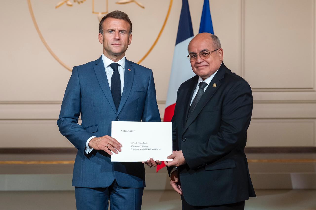 El acto tuvo lugar el pasado 19 de septiembre en el Palacio del Elíseo, donde el diplomático guatemalteco trasladó al mandatario francés un saludo de parte del Presidente de la República, Bernardo Arévalo, quien visitó Francia en febrero de este año.