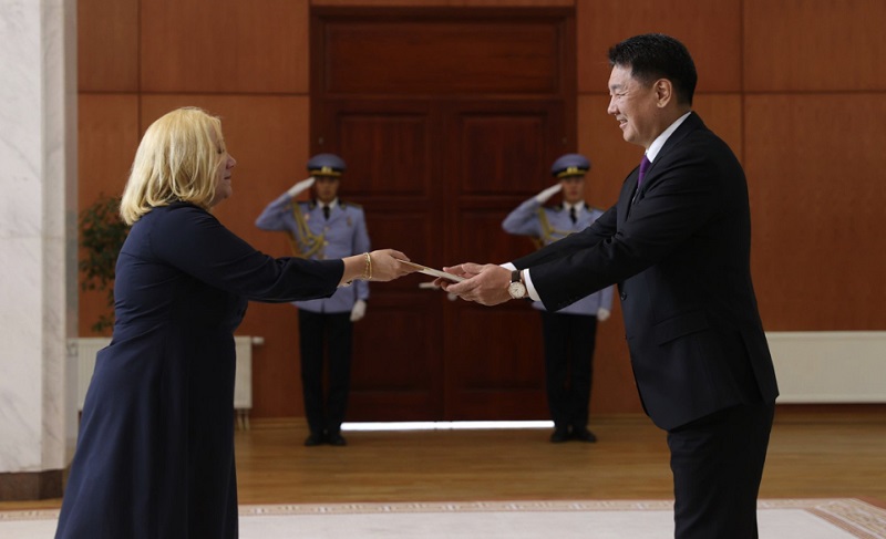 La solemne ceremonia, desarrollada en el Palacio de Estado en Ulán Bator, Mongolia, contó también con la presencia de la ministra de Relaciones Exteriores de Mongolia, Battsetseg Batmunkh, y el director general para las Américas, Anand Amgalan, entre otros.