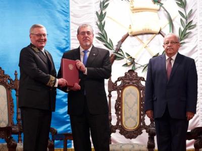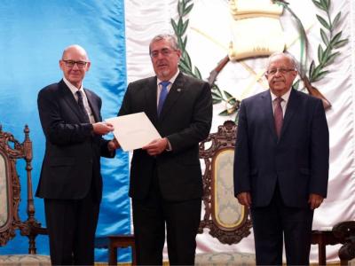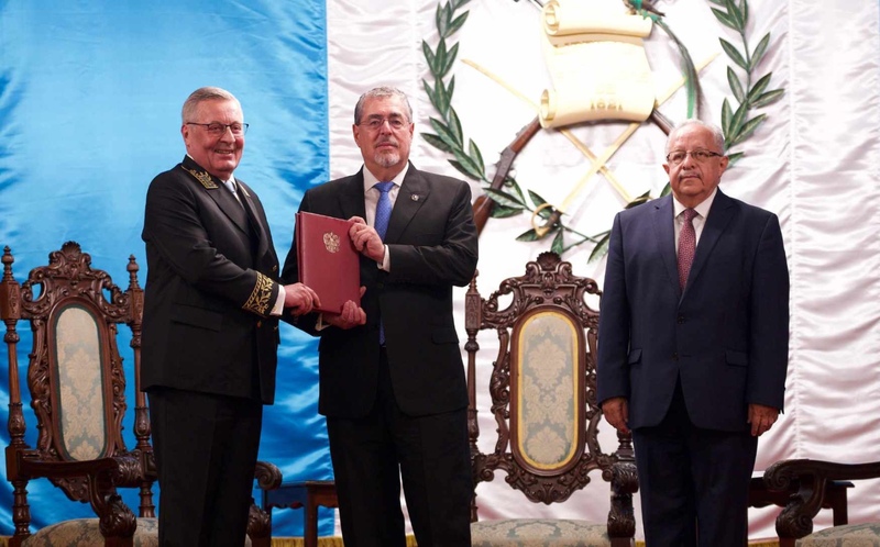 En la ceremonia, desarrollada en el Palacio Nacional de la Cultura, el Presidente, acompañado del Canciller, Carlos Ramiro Martínez, intercambió saludos y recibió los documentos que acreditan a Zaza Gabunia, Embajador de Georgia en México Concurrente para Guatemala; Gabriele Meucci, Embajador de Italia; Ricardo Tomás Polanco Reinoso, Embajador de República Dominicana; Annemarie Duncker Stecher, Embajadora de Chile, y Sergey Yurievitch Reschikov, Embajador de Rusia.