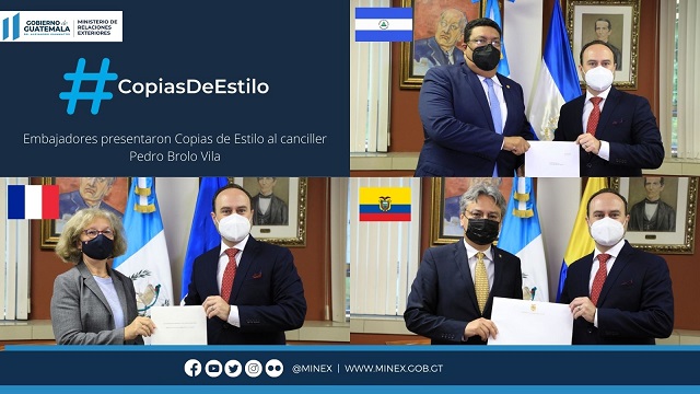 Guatemala, 18 de octubre de 2021. El ministro de Relaciones Exteriores, Pedro Brolo Vila, recibió este lunes las Copias de Estilo de los embajadores Odile Roussel, de Francia; Hernán Yánez González, de Ecuador, y Valdrack Ludwing Jaentschke Whitaker, de Nicaragua, para el ejercicio de sus funciones en Guatemala en representación diplomática de sus países.