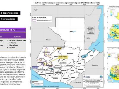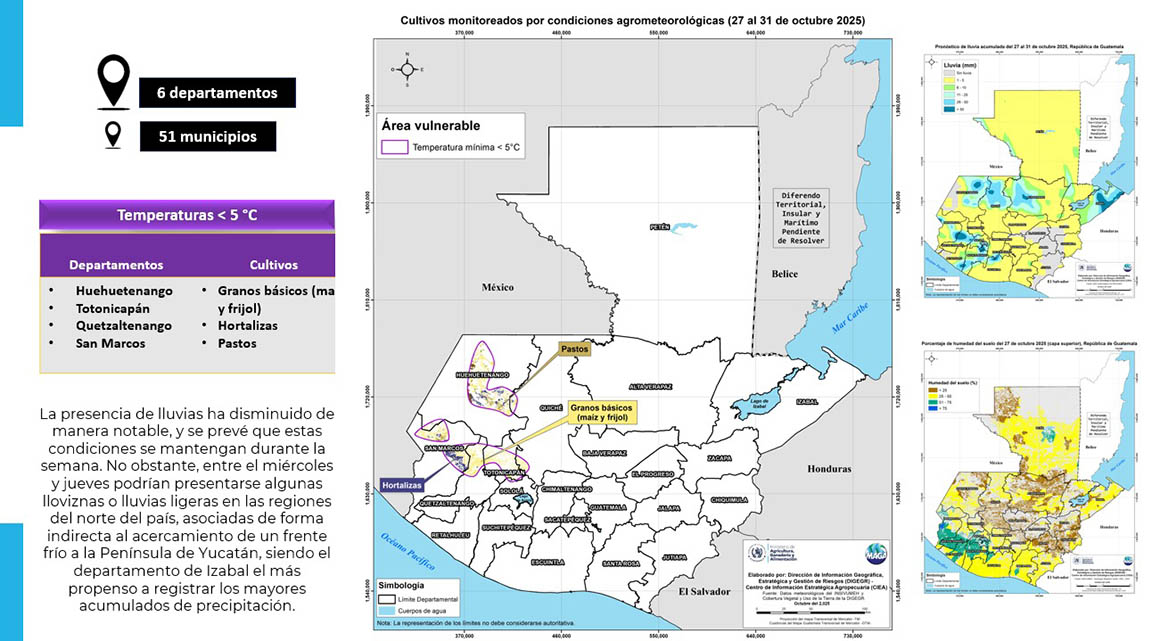 El monitoreo del MAGA abarca 6 departamentos y 51 municipios vulnerables, en los cuales se observa un cambio en las condiciones climáticas y temperaturas. Se estima que, en las zonas altas como Huehuetenango, Totonicapán y Quetzaltenango, pueden experimentar descensos hasta de cinco grados centígrados lo cual afecta cultivos de granos básicos, hortalizas y pastos.