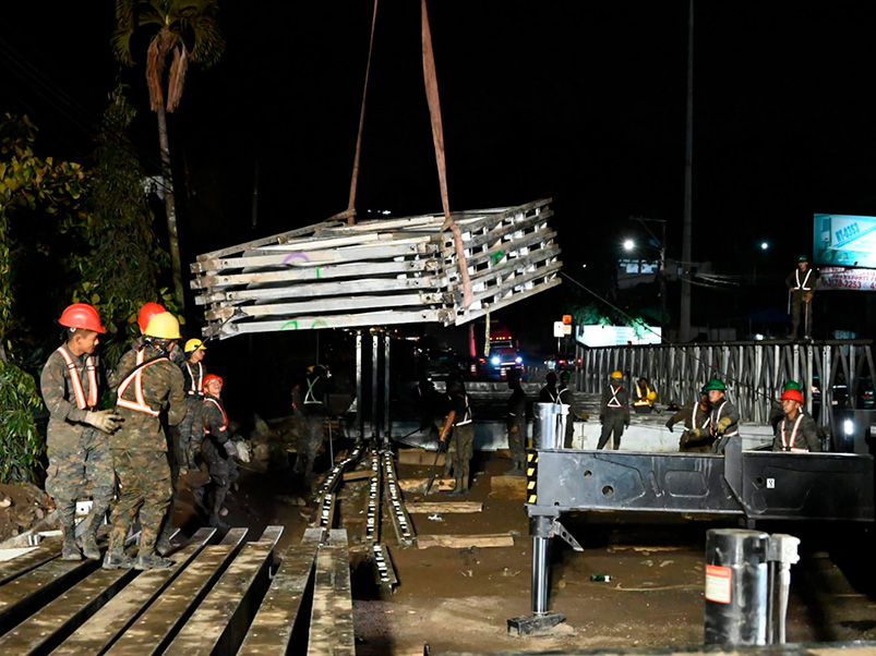 Desde el pasado 10 de noviembre, el Ejército de Guatemala a través del Cuerpo de Ingenieros del Ejército "Teniente Coronel de Ingenieros e Ingeniero Francisco Vela Arango" inició la operación de recuperación de un puente modular que se encontraba ubicado en el Km. 17.5 Ruta al Pacífico en jurisdicción de Villa Nueva.