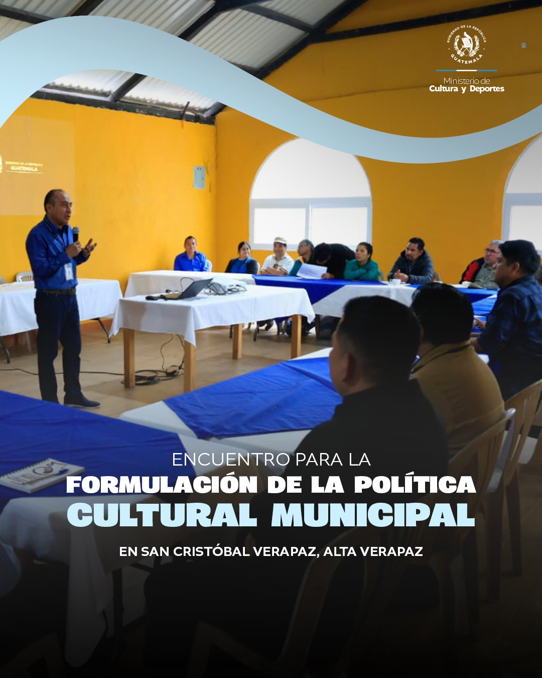Impulsamos la formulación de Políticas Culturales Municipales para proteger nuestra identidad. El municipio de San Cristóbal Verapaz fortalece sus raíces con el “Encuentro para la Formulación de la Política Cultural Municipal”, una iniciativa de esta cartera, a través de la Dirección General de Desarrollo Cultural, orientada a desconcentrar los procesos culturales y asegurar la salvaguarda y promoción de las expresiones culturales, tradiciones y patrimonio local. Mediante el diálogo con líderes comunitarios y artistas locales, se establecieron bases para: