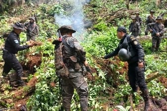 También agentes antinarcóticos y personal militar reportan la localización de un posible narcolaboratorio y plantaciones con arbustos de hoja de coca. La diligencia de búsqueda, localización y erradicación de cultivos ilícitos se desarrolla en un área boscosa de San Luis, Petén.