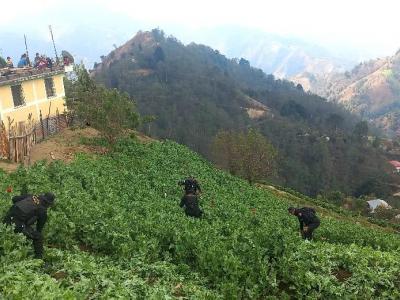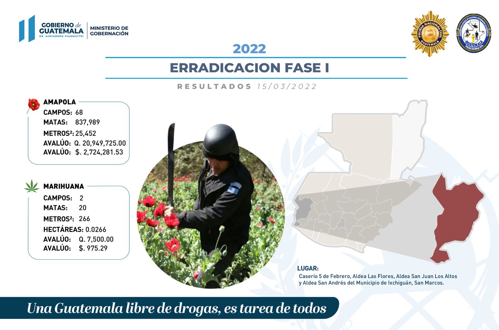 Este miércoles se ejecutó el segundo día de la primera fase de erradicación de cultivos ilícitos por parte de agentes de la Subdirección General de Análisis de Información Antinarcótica (SGAIA), en distintos caseríos del municipio de Ixchiguan en San Marcos, bajo las instrucciones del Ministro de Gobernación, David Napoleón Barrientos, a cargo del Quinto Viceministro, Fernando Rodas, como parte de los ejes de trabajo.