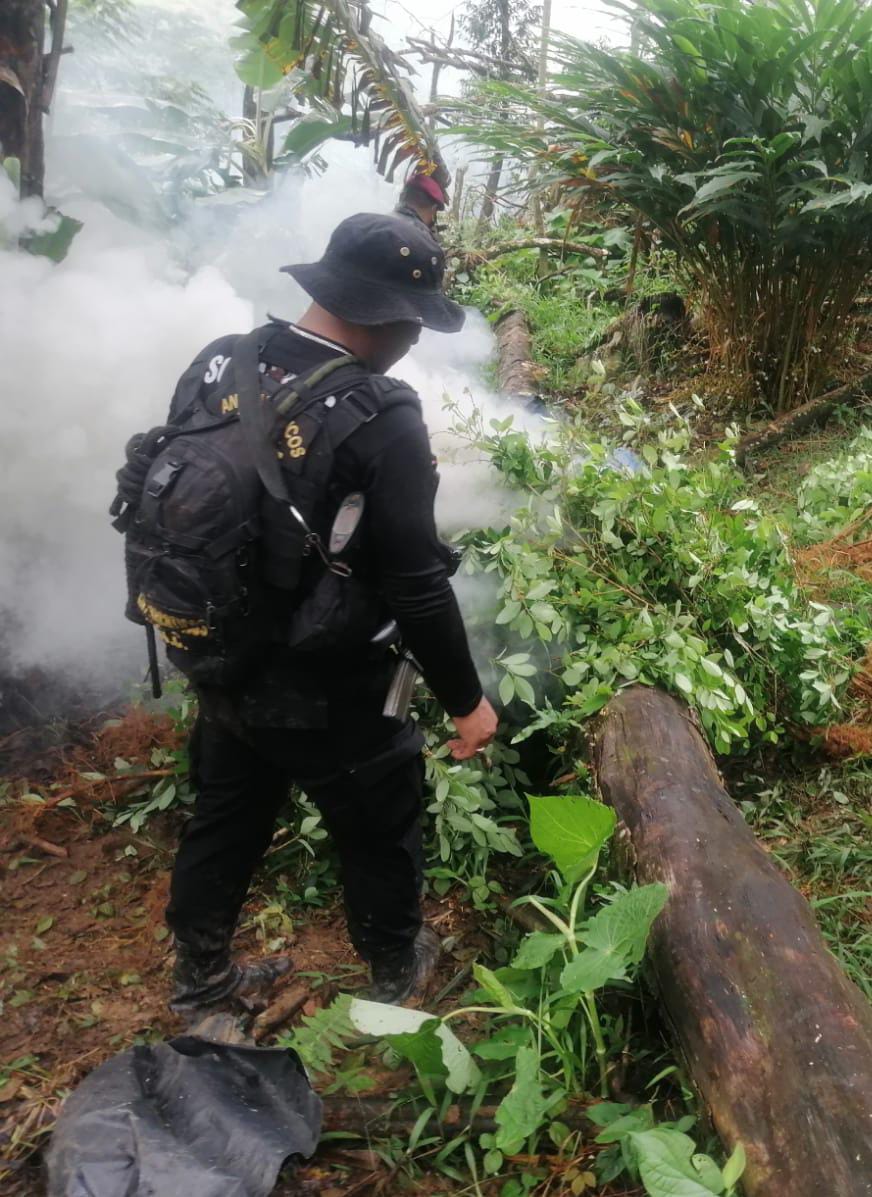 Por medio de un trabajo interinstitucional, elementos de la Subdirección General de Análisis de Información Antinarcótica (SGAIA) de la Policía Nacional Civil (PNC) y el Ejército de Guatemala, reportan la erradicación de 247 075 arbustos de hoja de coca en fase de crecimiento.
