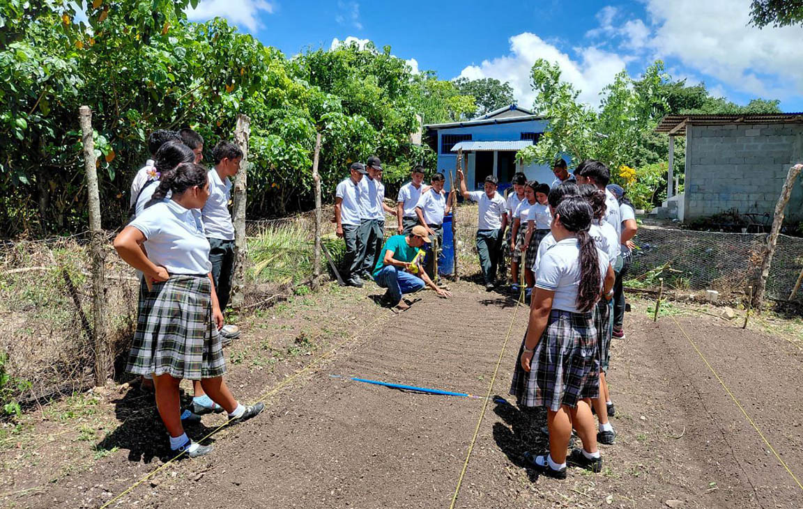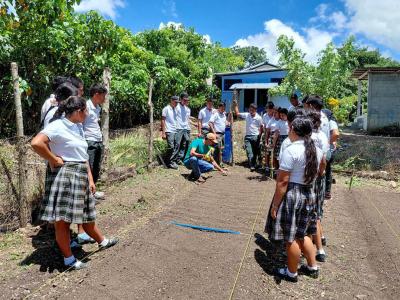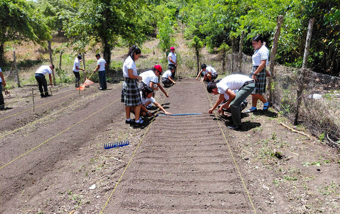 Estudiantes de la comunidad La Unión, en el municipio de Santa Ana, participaron en la creación de un huerto escolar con el acompañamiento del personal técnico de Extensión Rural. En dicho espacio fueron sembrados cultivos como cilantro, rábano, amaranto, yerba mora y pepino.