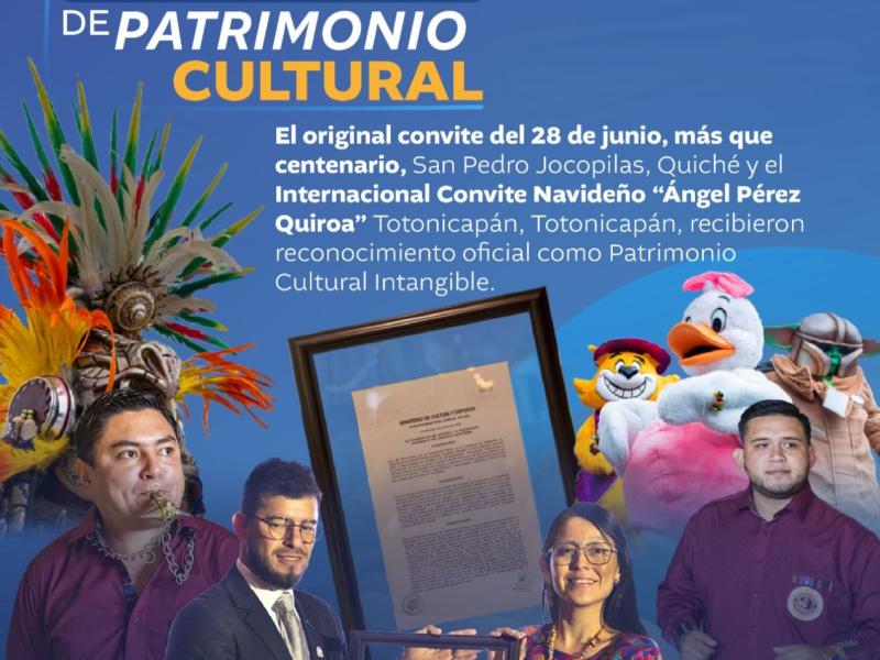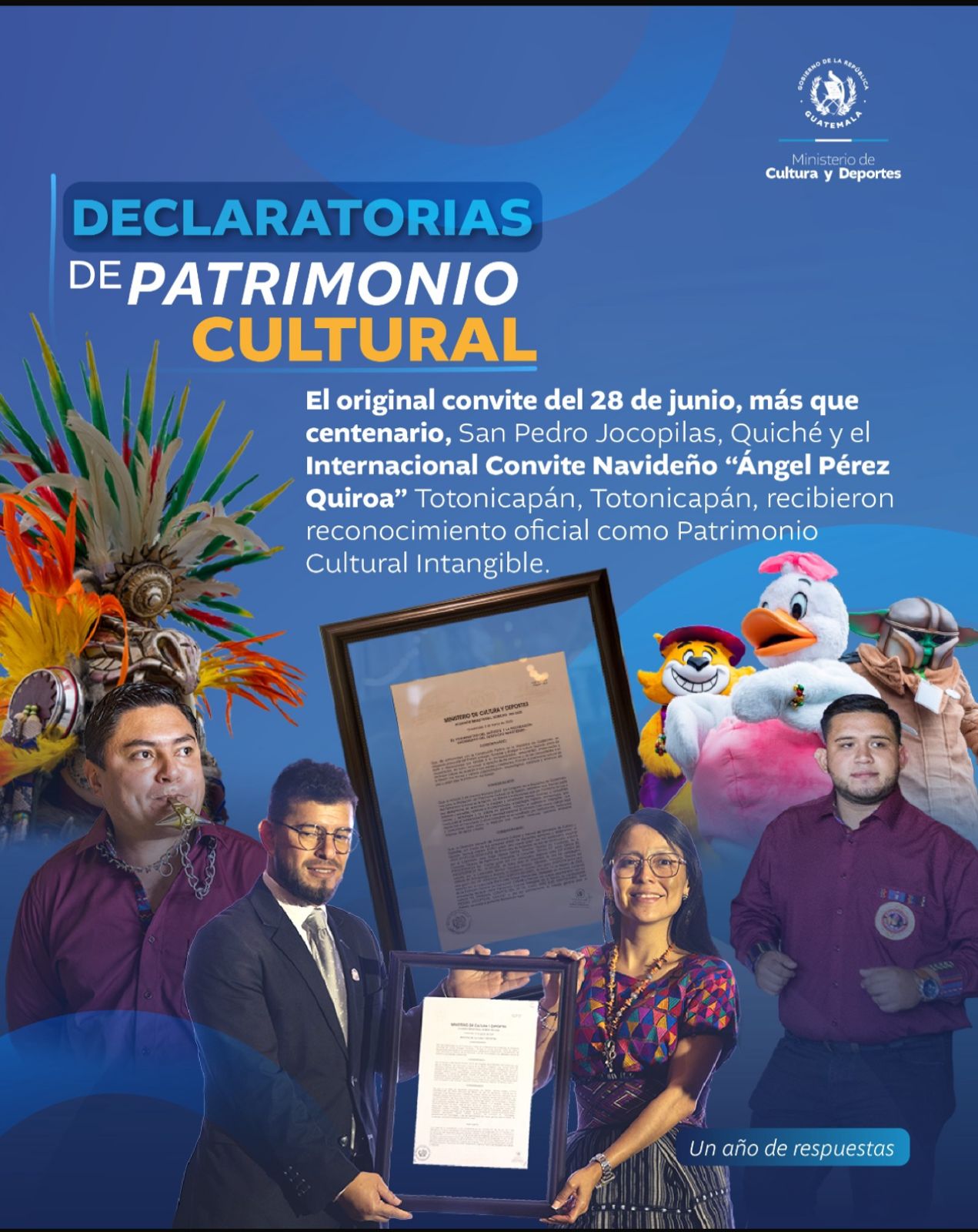 Se declaró como Patrimonio Cultural Intangible al Original Convite del 28 de Junio “Más Centenario”, de San Pedro Jocopilas, Quiché, así como al Internacional Convite Navideño “Ángel Pérez Quiroa”, de Totonicapán, Totonicapán.