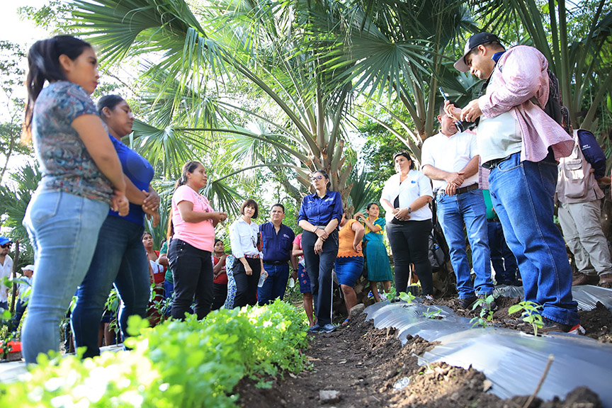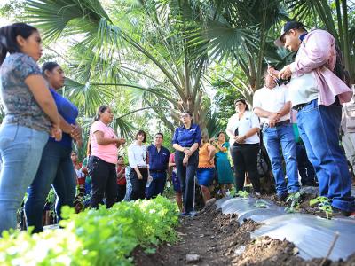 En dicha comunidad, representantes de la cooperación internacional y la viceministra de Seguridad Alimentaria y Nutricional, Klemen Gamboa, realizaron un recorrido para conocer de primera mano, los resultados que se han alcanzado con iniciativas como la Escuela de Campo Agrícola, en donde las y los vecinos aprenden acerca de la agricultura resiliente cultivando pepino, chile jalapeño, berenjena, entre otras hortalizas, las cuales utilizan para su consumo y el comercio.