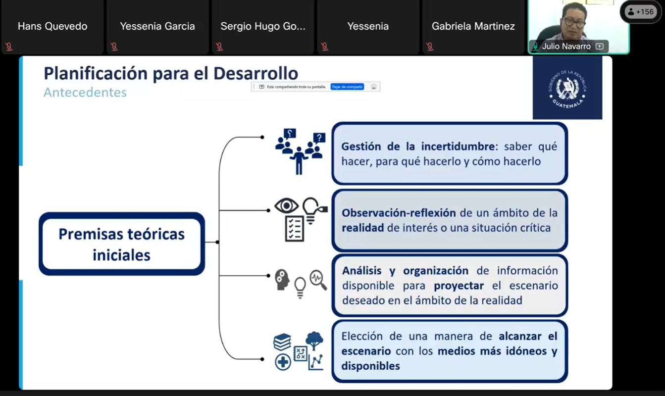 La disertación inaugural estuvo a cargo de Julio César Navarro Boj, director de Programación Sectorial y Territorial, de SEGEPLAN, quien abordó el contenido y la importancia de la Planificación con Enfoque de Gestión por Resultados (GpR).