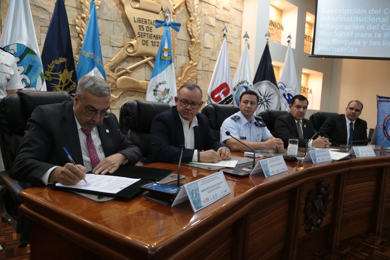 El Ministro de Salud Pública y Asistencia Social, Dr. Francisco Coma, junto a los Ministros de Gobernación, la Defensa Nacional; de Comunicaciones, Infraestructura y Vivienda; de Agricultura, Ganadería y Alimentación; y el Secretario de Inteligencia Estratégica del Estado, firmaron el “Convenio interinstitucional para la integración del Comité Nacional de Protección de los Buques y de las Instalaciones Portuarias”.