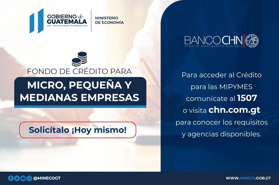 Este jueves, representantes del Ministerio de Economía (MINECO) y de la Comisión de la Pequeña y Mediana Empresa del Congreso de la República informaron por medio de una conferencia de prensa, que los recursos por Q400 millones del Fondo de Apoyo a las Micro, Pequeñas y Medianas Empresas ya están a disposición de los empresarios propietarios de MIPYMES, así como para las actividades de emprendimiento y será El Crédito Hipotecario Nacional (CHN) quien lo ejecutará por medio de su red de agencias bancarias.