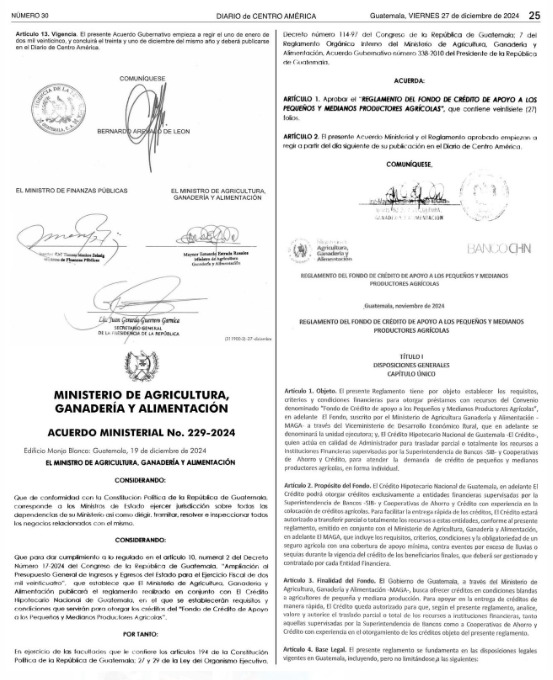 Con la publicación del Acuerdo Ministerial 229-2024 se oficializa el Convenio Interinstitucional entre el Ministerio de Agricultura, Ganadería y Alimentación (MAGA) y El Crédito Hipotecario Nacional (CHN), el cual da vida al Fondo de Crédito de Apoyo a los Pequeños y Medianos Productores Agrícolas (Crédito Campesino).