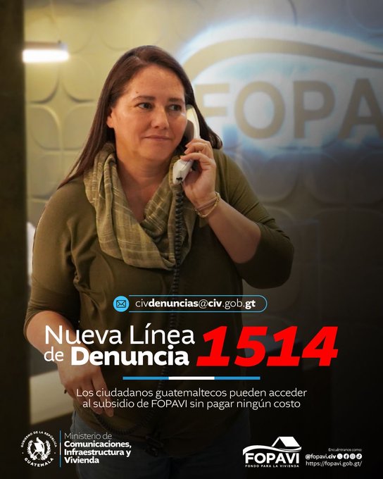 El Fondo para la Vivienda –FOPAVI– pone a disposición de la población la nueva línea de denuncia 1514 📲, para que los guatemaltecos puedan reportar cualquier irregularidad relacionada con el acceso a los subsidios habitacionales.