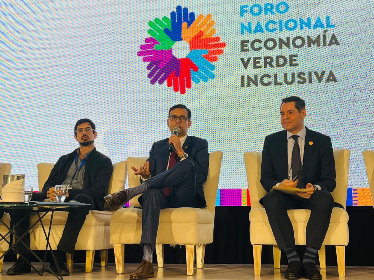 Durante la actividad, junto al Ministro de Finanzas, Edwin Martínez; el vice ministro de Recursos Naturales y Cambio Climático, Héctor Espinoza; el representante de la Universidad del Valle de Guatemala, Benjamín Leiva; y el representante del sector privado, Enrique Font, dialogaron sobre las condiciones propicias y las ventanas de oportunidad para la transición en Guatemala hacia una economía verde e inclusiva.