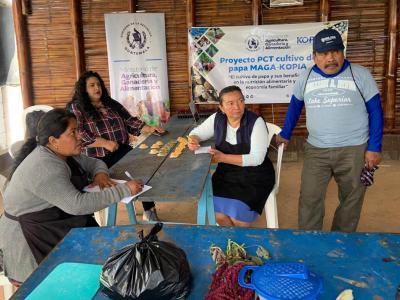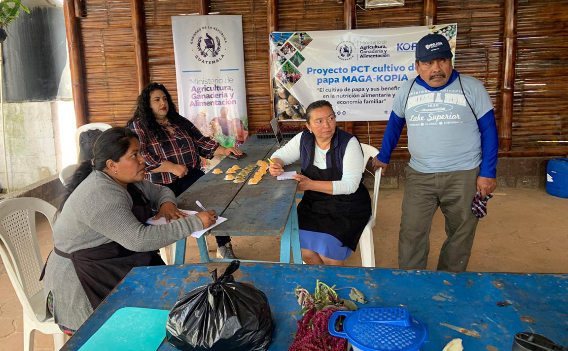 Por su parte, las productoras del Proyecto de Cooperación Técnica (PCT) del cultivo de papa KOPIA compartieron sus conocimientos sobre la importancia y los beneficios nutricionales de la papa, así como su potencial para la generación de valor agregado a través de la transformación artesanal. Expusieron diversas formas de agroprocesamiento de este cultivo, incluyendo la elaboración de subproductos como jugo de papa, dulce, atol, jabón aclarante, mascarillas faciales y jabón con glicerina.