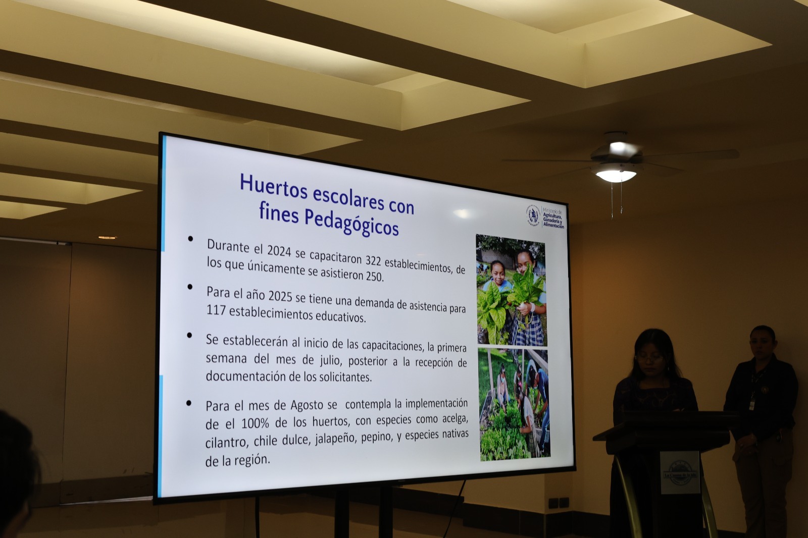 También se informó sobre la implementación y seguimiento de 734 huertos familiares y 22 huertos comunales distribuidos en los 14 municipios del departamento de Petén, con el objetivo de fortalecer la seguridad alimentaria a nivel local.