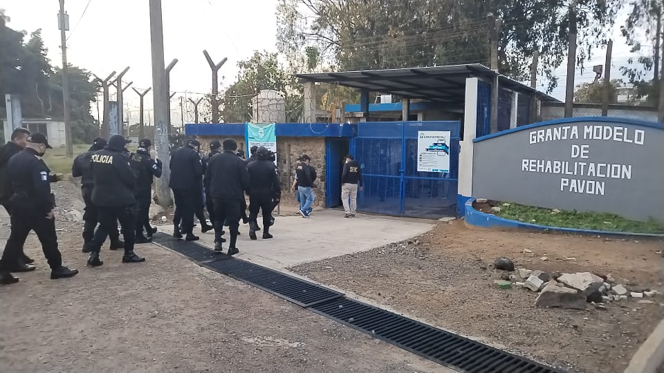 Elementos de la División Especializada en Investigación Criminal (DEIC), agentes de las Comisarías del Distrito Central de la Policía Nacional Civil (PNC), y personal del Sistema Penitenciario (SP) realizan una requisa sorpresiva en la Granja Modelo de Rehabilitación Pavón, Fraijanes, Guatemala.