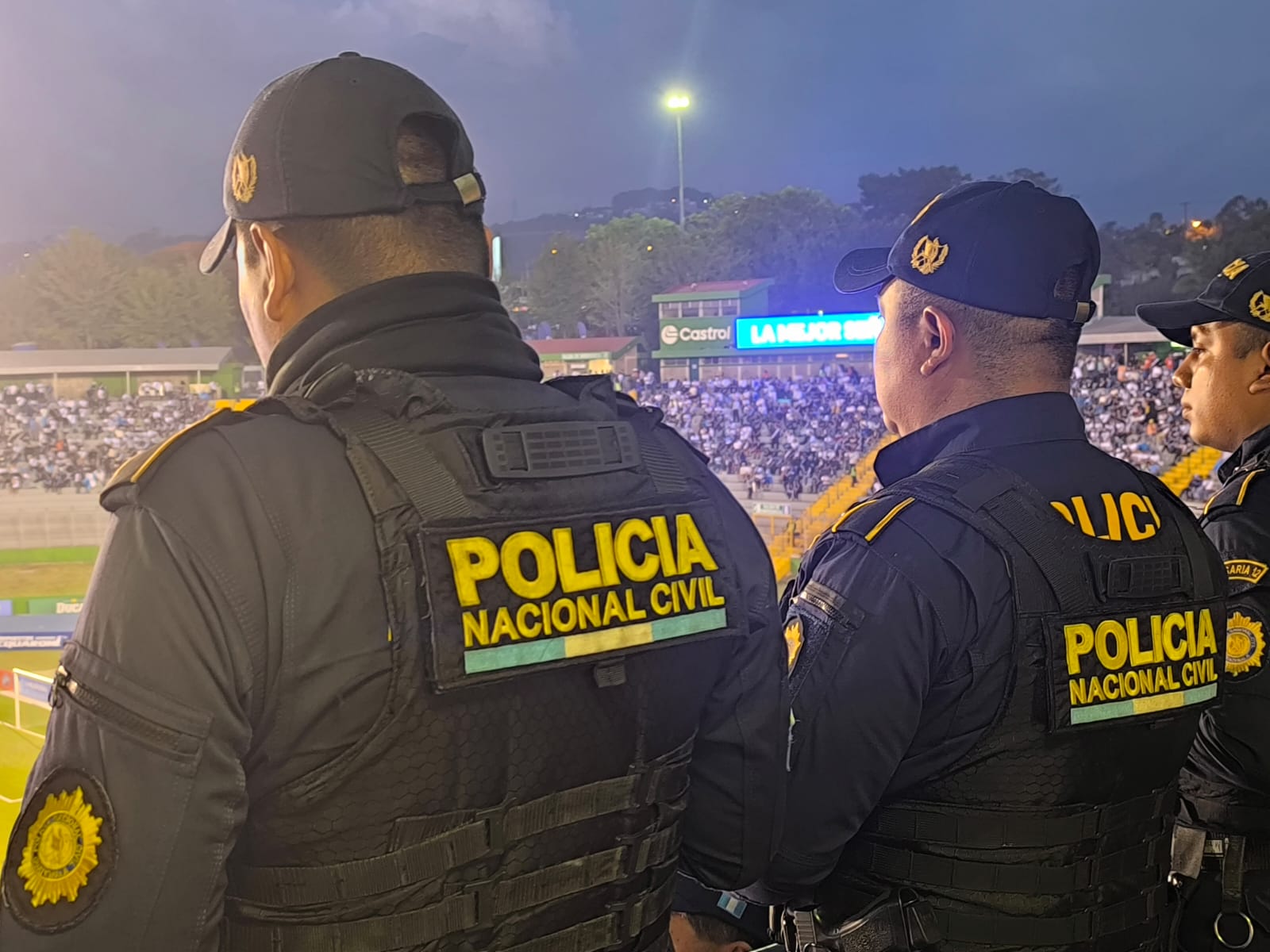 Las fuerzas policiales instalaron dispositivos de seguridad para proteger la vida, integridad y bienes de los aficionados guatemaltecos que tiñeron el Estadio Cementos Progreso, con los colores azul y blanco que porta con orgullo la bicolor. También se desarrollaron incursiones a pie y patrullajes motorizados para garantizar la seguridad perimetral en este recinto deportivo.