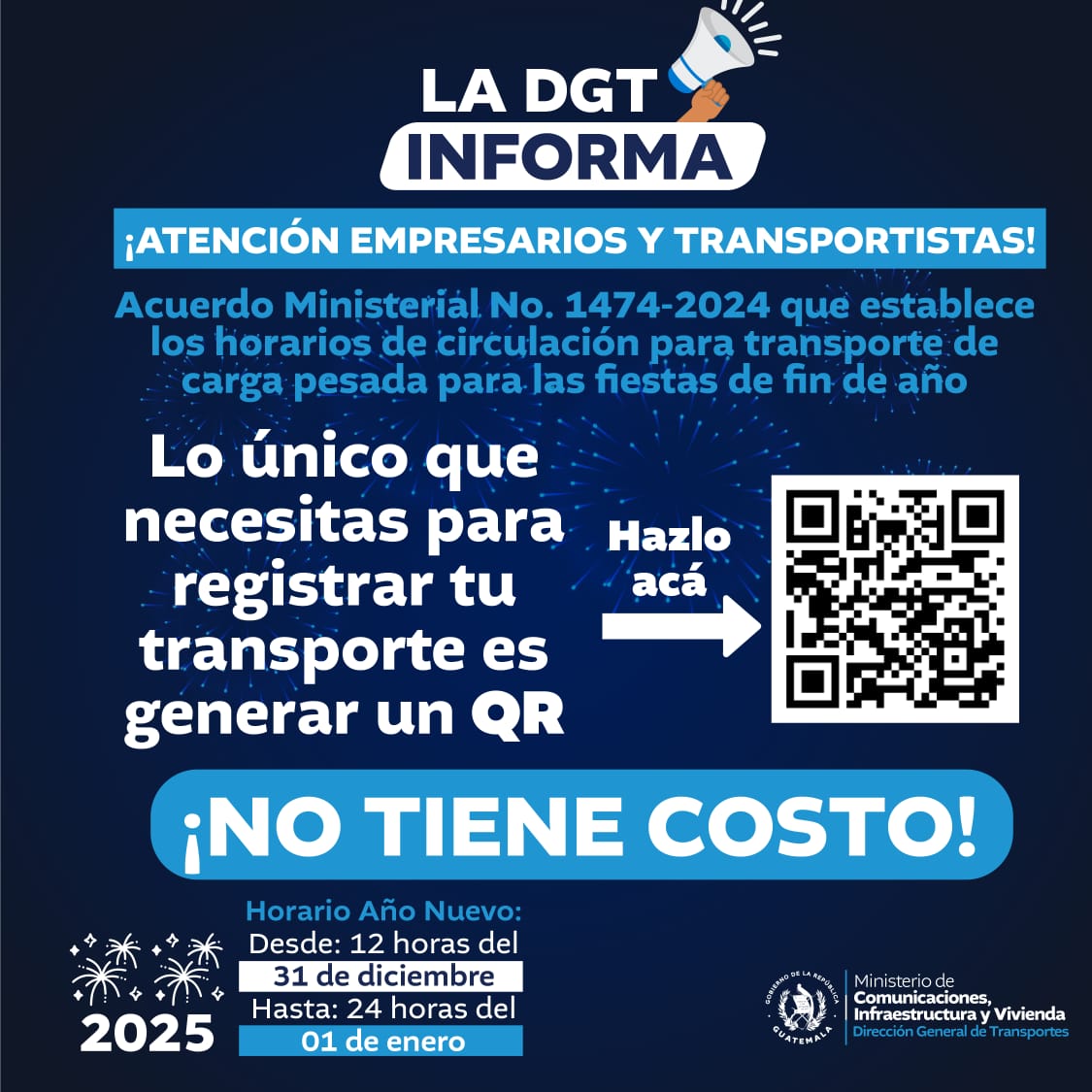 La herramienta de generación de códigos QR, creada por la Dirección General de Transportes (DGT), permitió evitar actos anómalos en la circulación de empresarios y transportistas de carga pesada con artículos perecederos, alimentos, bebidas, combustibles o grúas durante la Navidad, lo cual tuvo buena aceptación dentro del gremio transportista. Durante la Navidad se generaron 5 mil 313 códigos QR y fueron escaneados mil 950 como forma de supervisión.