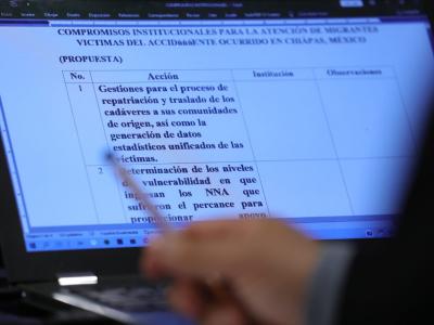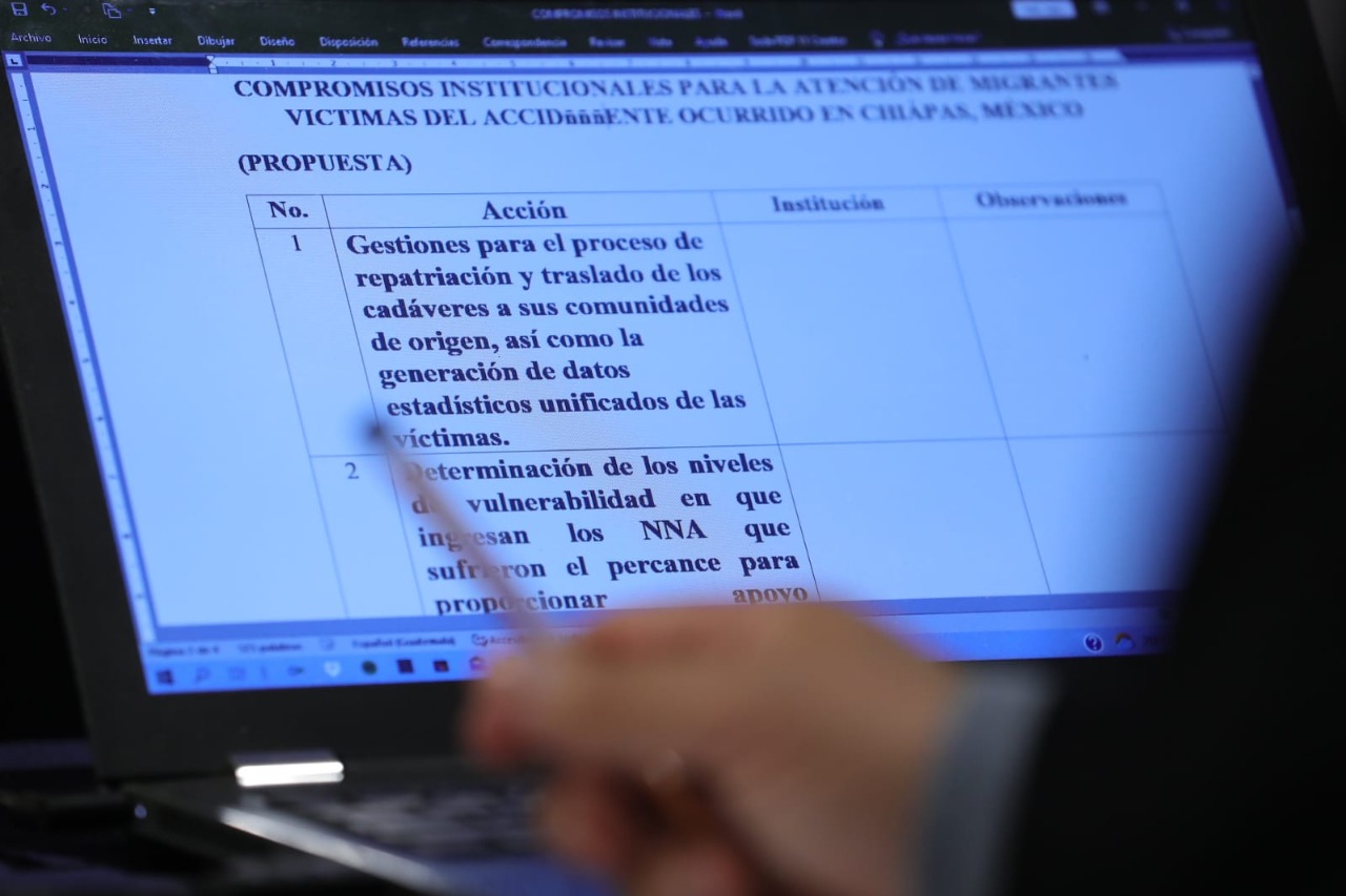 La reunión del equipo interinstitucional fue convocada por la Cancillería y el INM para coordinar las acciones que realizará cada institución del Estado de Guatemala “en el ámbito de su competencia, para acelerar procesos” y atender con prioridad a los guatemaltecos afectados por el siniestro ocurrido el jueves pasado en la carretera próxima a la capital chiapaneca.