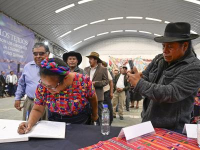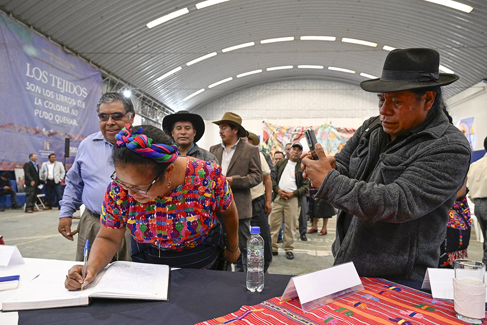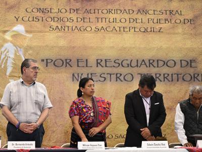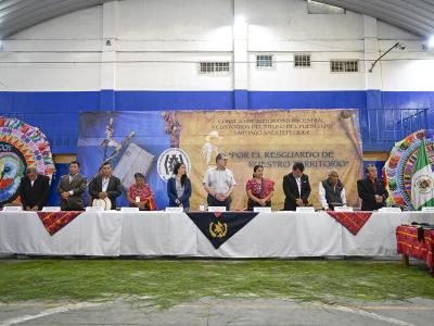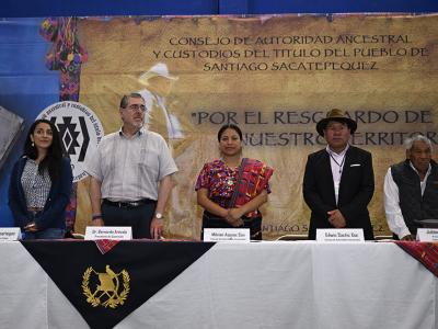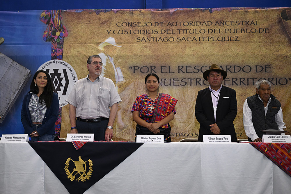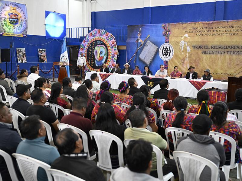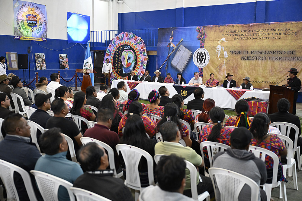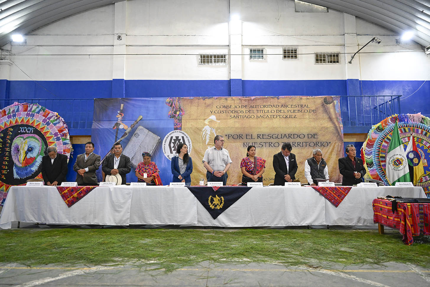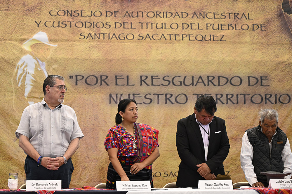 Durante la ceremonia, se rindió homenaje a las autoridades indígenas ancestrales que han partido, reconociendo su legado y lucha histórica en la defensa del territorio y los derechos del pueblo kaqchikel de Santiago Sacatepéquez. El evento contó con la participación del presidente Arévalo, la subsecretaria Privada de Asuntos y Relaciones Políticas, Mónica Mazariegos, y autoridades comunitarias.