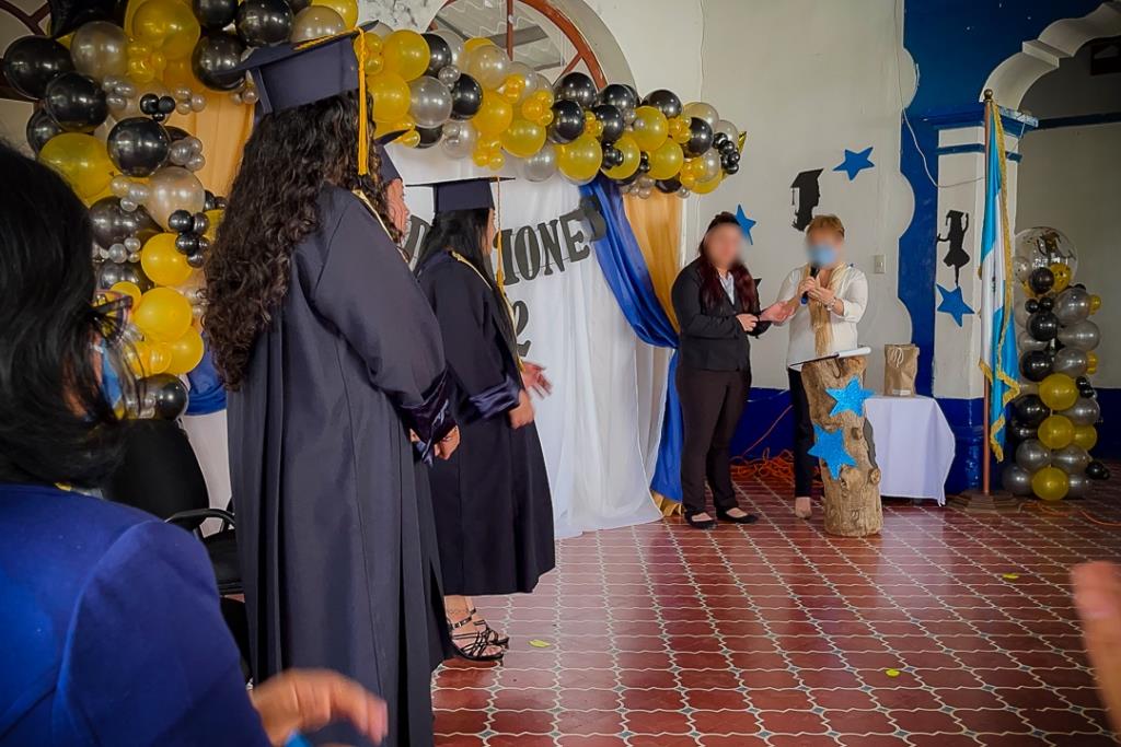 Junto a ella, se graduaron dos adolescentes más, quienes durante el ciclo escolar elaboraron un portafolio con todos sus proyectos. La abanderada fue *Paola, ella pidió ponerse su traje regional, pues es originaria de Totonicapán, orgullosa de sus raíces portó el Pabellón Nacional y le dedicó su logro a sus hermanitos y mamá, a quienes les entregó su seminario impecablemente terminado.