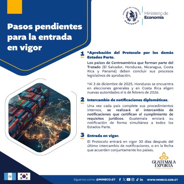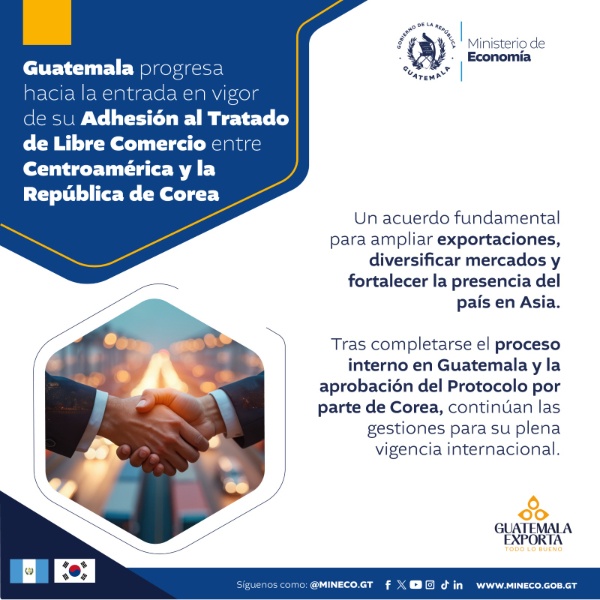 Este proceso se impulsa desde el ámbito de competencia del Ministerio de Economía, el Ministerio de Relaciones Exteriores, las representaciones diplomáticas de Guatemala en Centroamérica y Corea y la Comisión designada por el Congreso de la República.