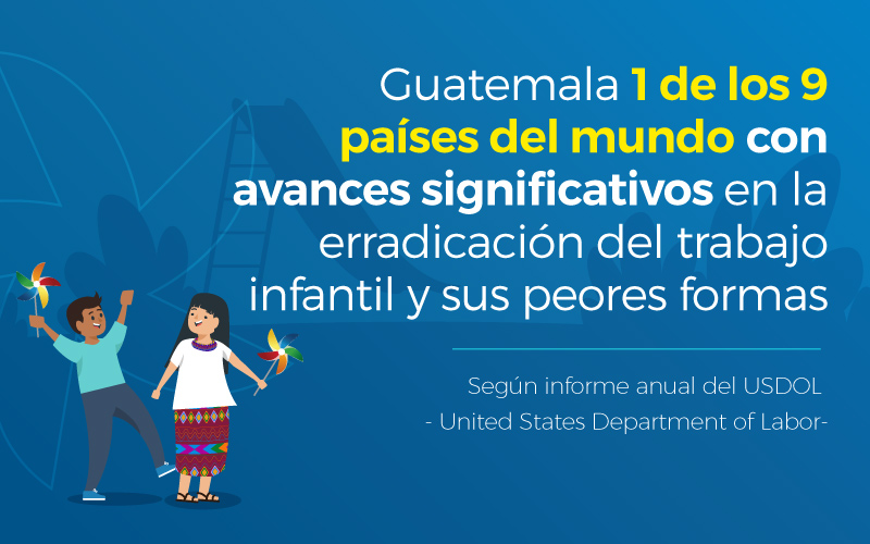 Guatemala, 29 de septiembre de 2022. El Ministerio de Trabajo y Previsión Social se complace en informar a la población guatemalteca que el Departamento de Trabajo de Estados Unidos (USDOL, por sus siglas en inglés) presentó su informe anual sobre peores formas de trabajo infantil y trabajo forzoso en el mundo, en el que destacó a Guatemala dentro de los 131 países evaluados, como uno de los nueve con avances significativos. Con la calificación obtenida por el trabajo realizado en 2021, Guatemala sube dos puntos en el ranking respecto al año anterior.