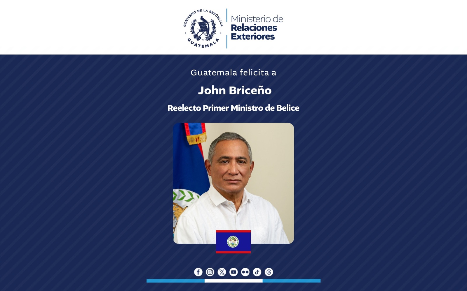 Guatemala, 13 de marzo de 2025. El Gobierno de la República de Guatemala, a través del Ministerio de Relaciones Exteriores, expresa su más sincera felicitación al Primer Ministro de Belice, John Briceño, por su reelección en la jornada electoral celebrada el 12 de marzo, durante la cual el pueblo beliceño demostró su vocación cívica y democrática.