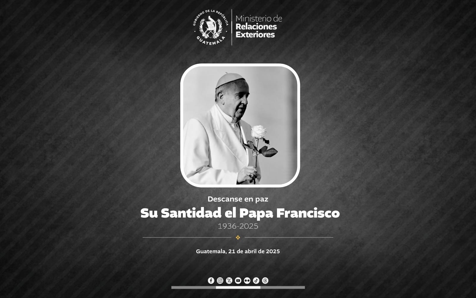 Guatemala, 21 de abril de 2025. El Gobierno de la República de Guatemala, a través del Ministerio de Relaciones Exteriores, lamenta profundamente el fallecimiento de Su Santidad el Papa Francisco.