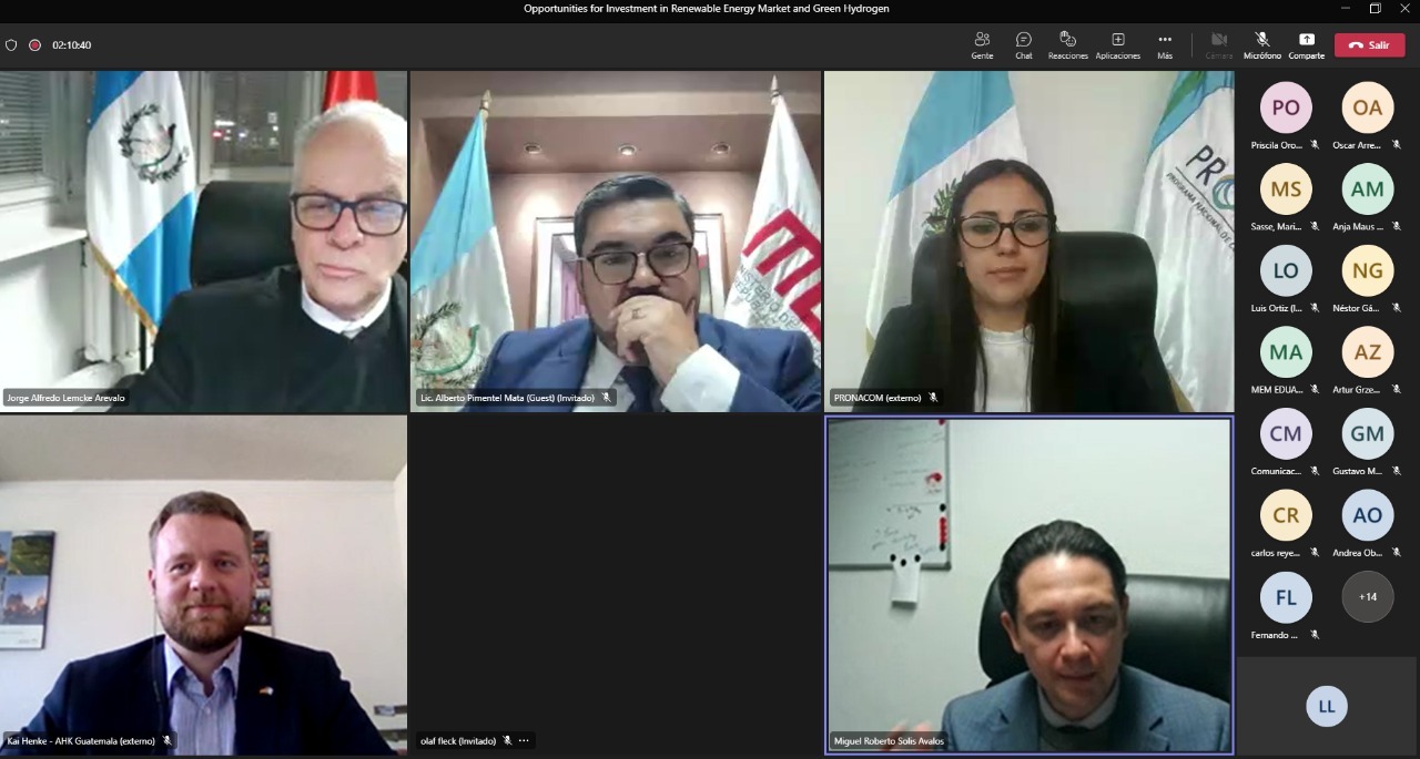 Berlín, Alemania, 9 de diciembre de 2022. El Gobierno de Guatemala, a través de la Embajada de Guatemala en Alemania, organizó pasado 7 de diciembre el conversatorio virtual “Oportunidades para Inversión en Mercado Energías Renovables e Hidrógeno Verde”. La actividad contó con la participación del ministro de Energía y Minas, Alberto Pimentel y la vicecanciller Shirley Aguilar, al igual que representantes del Ministerio Federal de Economía y Acción Climática de Alemania, la Cámara de Comercio e Industria Guatemalteco-Alemana y personal de compañías del Consorcio de Energía Alemán.