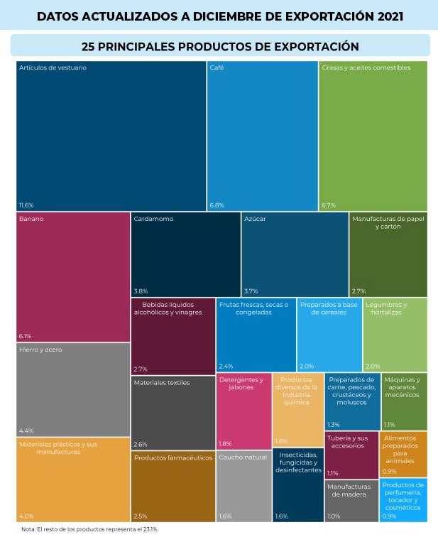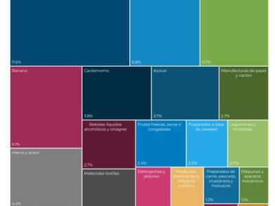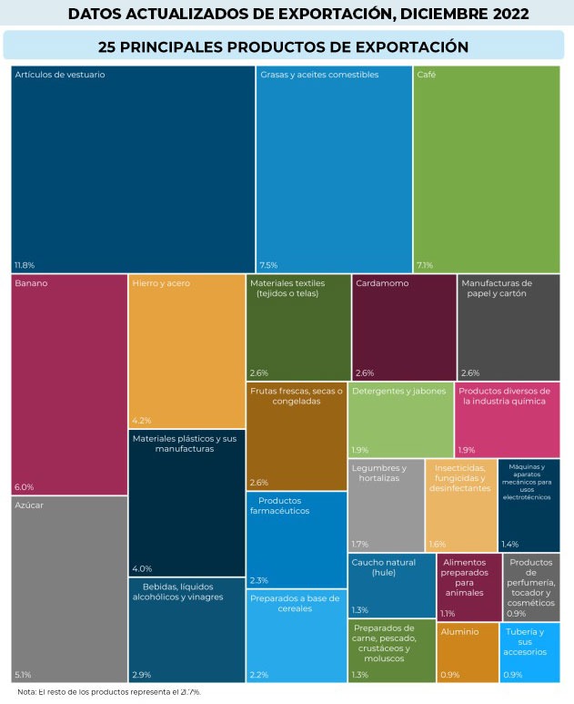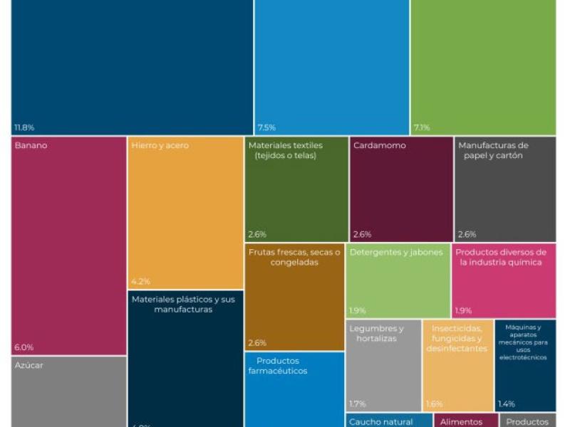 Otro ejemplo del dinamismo de los productos de exportación es el del cardamomo, que diciembre de 2021 representó el 3.8% de las exportaciones totales del país en la séptima posición de importancia y en el mismo mes del 2022 bajó al noveno lugar, representando el 2.6% de lo exportado ese año. En 2022 los materiales plásticos y sus manufacturas (4%) sustituyeron al cardamomo en la séptima posición en orden de importancia.