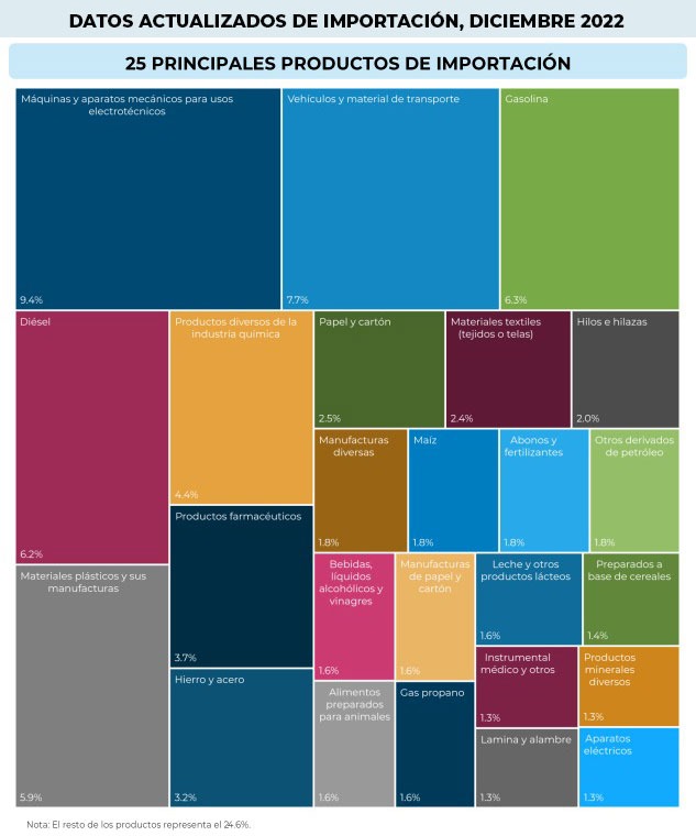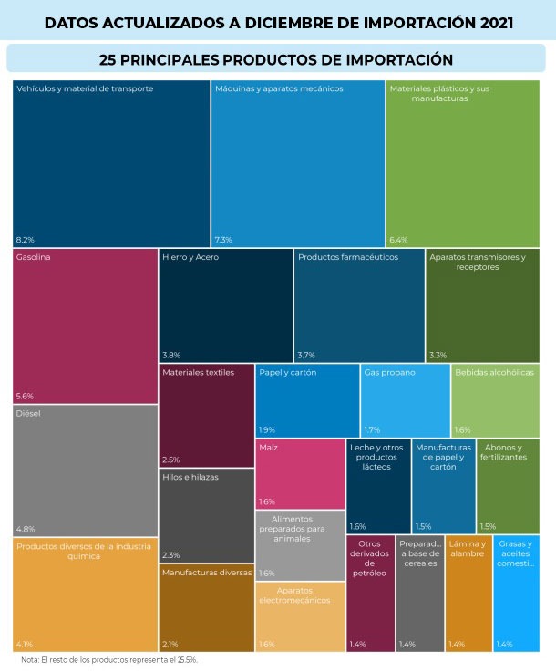 Al igual que las exportaciones, las importaciones también muestran cambios en posición y tamaño porcentual del total adquirido. A diciembre del año pasado, las máquinas y aparatos mecánicos para usos electrotécnicos se ubicaron en el primer lugar en las compras del país, con el 9.4% del total; seguidos por los vehículos y material de transporte, con 7.7% del total; mientras que en la tercera posición se situó la gasolina, con el 6.3% y el cuarto lugar fue para el diésel, con 6.2%; en tanto que los materiales plásticos y sus manufacturas se quedaron en lugar número cinco, con 5.9%.