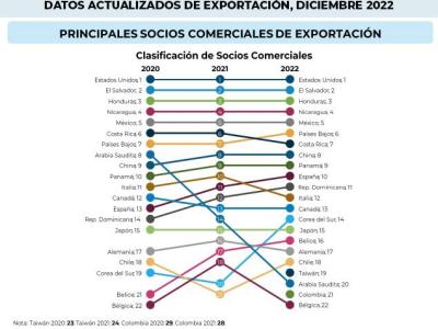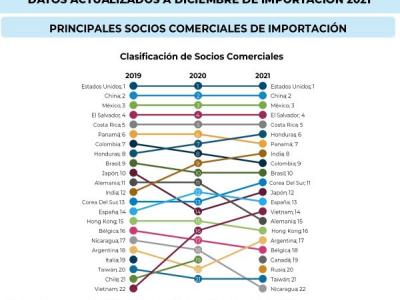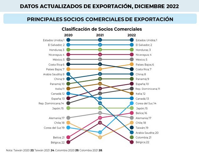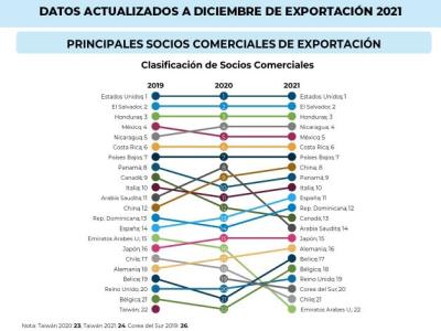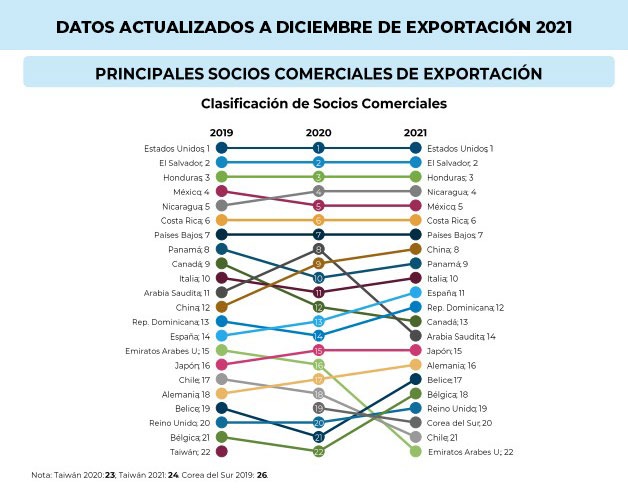 Con relación a los principales socios comerciales de Guatemala, el informe mencionado hace referencia al cambio de posiciones en los cuatro últimos años con relación a la posición de países exportadores e importadores. Para las exportaciones siguen invariables las primeras tres posiciones en el orden de importancia para Estados Unidos, El Salvador y Honduras.