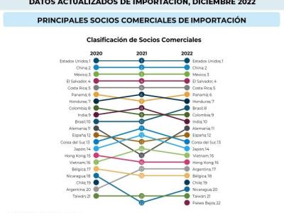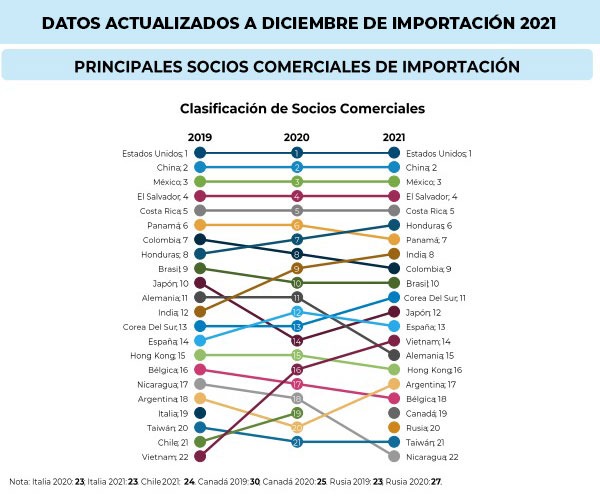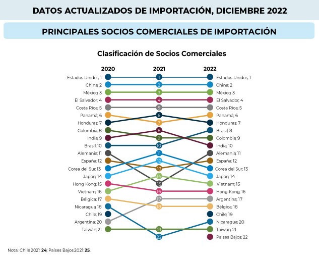 En tanto que los países importadores En ambos casos, las posiciones siguen sin cambiar para las primeras cinco posiciones, en donde se observa en orden de importancia a Estados Unidos, China, México, El Salvador y Costa Rica.