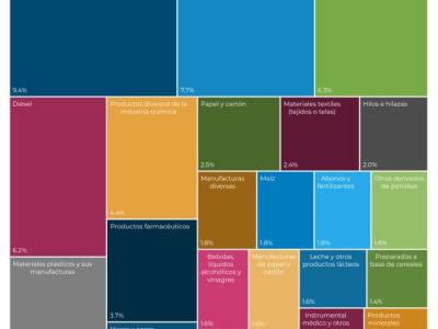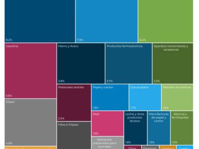 Mientras que, a diciembre de 2021, recién pasada la pandemia de COVID-19, los vehículos y material de transporte (8.2%) estaban en la primera posición, seguidos en el orden por máquinas y aparatos mecánicos (7.3%), materiales plásticos y sus manufacturas (6.4%), gasolina (5.6%) y el diésel (4.8%).